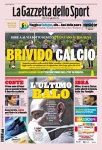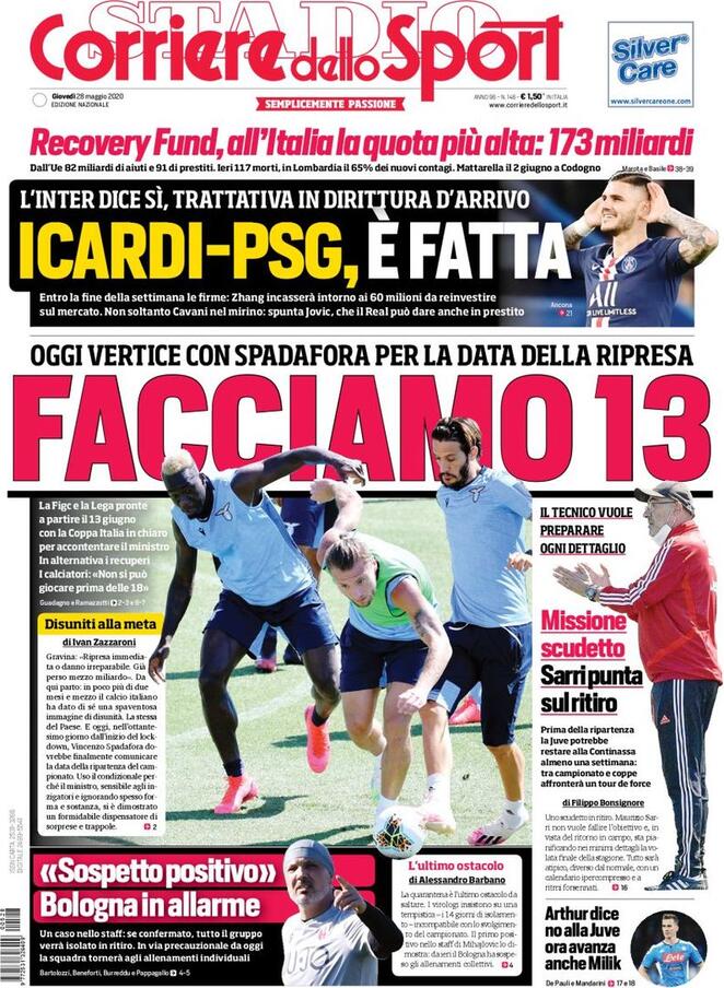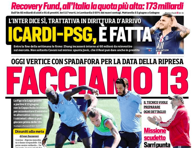 Si apre attraverso le pagine dei giornali sportivi la giornata che dovrebbe assicurare alla Serie A una sua data di ripartenza. “Facciamo 13” è il titolo scelto dal Corriere dello Sport riferendosi alla data prevista per i recuperi della 26esima giornata. “Brivido calcio” quello riportato dalla Gazzetta dello Sport, che evidenzia come alla vigilia della decisione finale di Governo e Comitato Tecnico-Scientifico ci sia stata la notizia di un sospetto positivo nello staff del Bologna. Non si tratta di Mihajlovic, tuttavia la squadra felsinea potrebbe essere costretta a due settimane di isolamento e quarantena, come previsto dal protocollo. Tuttosport, poi, si concentra sulle dichiarazioni del presidente FIGC Gravina che chiede di tornare in campo non soltanto perché si sono già persi 500 milioni di euro, ma anche perché tornerebbero in campo 100 milioni di lavoratori e quasi un milione e mezzo di tesserati.