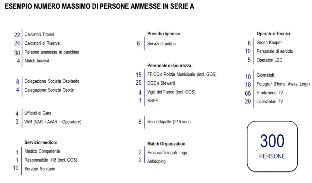 “La fascia temporale di gestione del giorno gara dovrà essere considerata nell’arco di 10 ore di attività, compresa la partita, suddivisa in diverse finestre temporali (ciascuna delle quali è di circa due ore). I lavori di preparazione ed allestimento nel giorno gara dovranno essere completati con anticipo rispetto all’arrivo delle Squadre e degli Arbitri allo Stadio, nonché includere apposita sanificazione degli ambienti interessati”. Si apprende dal documento che viene confermato come “il numero massimo di persone ammesse allo Stadio è stabilito in 300 unità per il Campionato di Serie A (proporzionalmente inferiore per le gare di Serie B e Serie C), suddiviso per le diverse attività. Il numero di persone autorizzate deve essere ridotto alle figure strettamente necessarie per rispettare i parametri di sicurezza e garantire i servizi connessi all’organizzazione”.