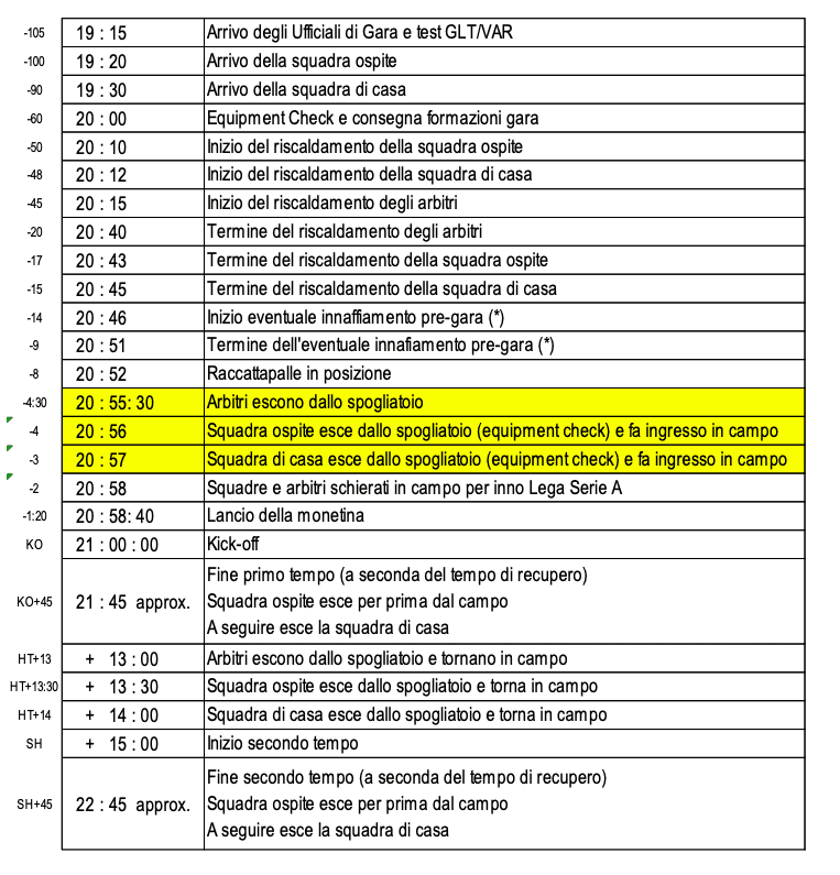 Infine, interessante perché mai presentata in precedenza la tabella fornita presente ne documento della FIGC, che ipotizza una gara con fischio d’inizio alle ore 21. Minuto per minuto, sarà da rispettare una tabella che non prevederà strappi alla regola (vedi foto sotto). Giocatori ed arbitri entreranno in momenti differenti sia allo stadio, sia sul terreno di gioco, ma rispettare le indicazioni sia prima che dopo risulterà fondamentale.