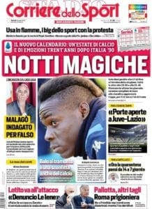 l’ultimo Mondiale giocato in Italia nel 1990. Si parla anche di Mario Balotelli, che potrebbe terminare anzitempo la sua avventura al Brescia, e dell’indagine per falso nella quale è stato coinvolto il presidente del CONI, Giovanni Malagò, nell’ambito dell’elezione del presidente Micciché. Sul Corriere dello Sport si legge di un’ipotesi di reato che farebbe riferimento ad un falso nel verbale dell’elezione di Micciché in Lega. Lo stesso quotidiano ricorda che l’indagine è partita da alcune dichiarazioni del presidente Preziosi. L’inchiesta della Procura Federale, nata proprio da quelle dichiarazioni, è già stata archiviata, ma adesso la palla è passata alla Procura di Milano. “Sono assolutamente tranquillo – ha dichiarato al Corriere dello Sport lo stesso presidente del CONI – e tutti sono sempre stati a conoscenza dei fatti che si sono svolti nell’assoluta trasparenza. È un atto dovuto della magistratura: tutto si chiarirà al massimo entro dieci giorni, anche meno”.