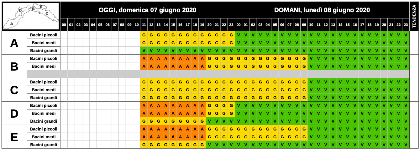 L’allerta meteo gialla per la giornata di domenica 7 giugno su tutta la regione Liguria è stata accresciuta nei settori B, D ed E da gialla ad arancione. Sino alle ore 20 sarà arancione, dopodiché tornerà gialla (e gialla persisterà nei settori B, C ed E sino alle ore 10 di domani, lunedì 8 giugno).