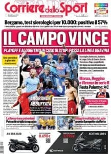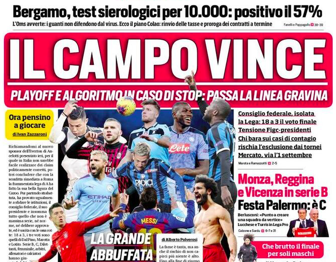 Largo spazio questa mattina sui quotidiani per la “linea Gravina“, quella passata in Consiglio Federale, che ha visto bocciare prima la proposta del blocco delle retrocessioni da parte della Lega Serie A, dopodiché approvare playoff e playout per decidere il campionato in caso di eventuale nuovo stop. Passato anche l’algoritmo, con una sua formula ufficiale: sarà solamente l’ultima ipotesi in caso di impossibilità nel concludere anche gli spareggi scudetto e retrocessione.