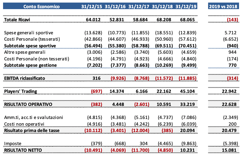 L’Assemblea degli azionisti del Genoa ha approvato il Bilancio dell’anno 2019, che copre due diverse stagioni sportive: il secondo semestre della stagione 2018/19 e il primo di quella in corso. La Società ha chiuso l’anno con un utile di esercizio di 10,2 milioni di Euro (20,5 prima delle tasse). Questa l’evoluzione dei numeri negli ultimi cinque anni (i valori sono espressi in migliaia di euro).