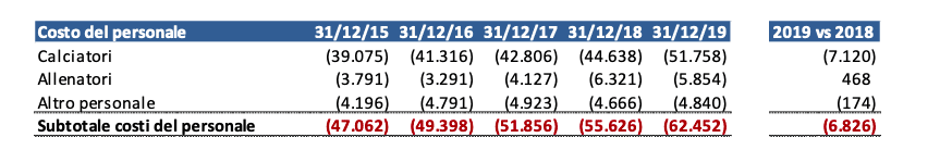 Il problema del costo della rosa, come già osservato negli anni passati, dovrebbe essere affrontato e risolto perché, da solo, assorbe quasi la totalità dei ricavi. Purtroppo questo è un obiettivo ribadito nel tempo che però non viene raggiunto, mentre invece sarebbe determinante per un maggiore equilibrio dei costi. Anche in questo caso si tratta di un male comune alla maggior parte delle squadre di Serie A, cosa che però non consola.