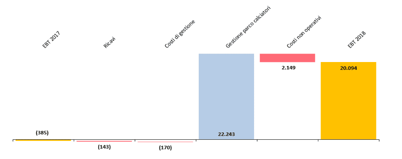 Negli ultimi cinque anni il Genoa ha prodotto con questa voce oltre 87 milioni di euro, dei quali 45 mln nel solo 2019. Evento eccezionale, dovuto in particolare alle cessioni di Piątek e Romero, che hanno consentito di raggiungere un risultato positivo di esercizio dopo tanti anni. Non a caso la differenza nel risultato della gestione del parco calciatori rispetto al 2018 (22,9 mln) è grosso modo quella che troviamo riflessa, in positivo, sul risultato prima delle tasse, migliorato di 20 milioni.