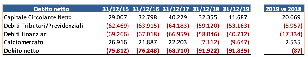 Analizzando la composizione delle voci, è possibile osservare come vi sia stata una significativa riduzione dei crediti a breve termine (probabilmente per effetto delle tempistiche di incasso della cessione di Piątek al Milan e della contestuale riduzione del credito verso la controllante per il consolidato fiscale), ma anche dei debiti finanziari (verso banche e factor), scesi di quasi il 30% (17 milioni).