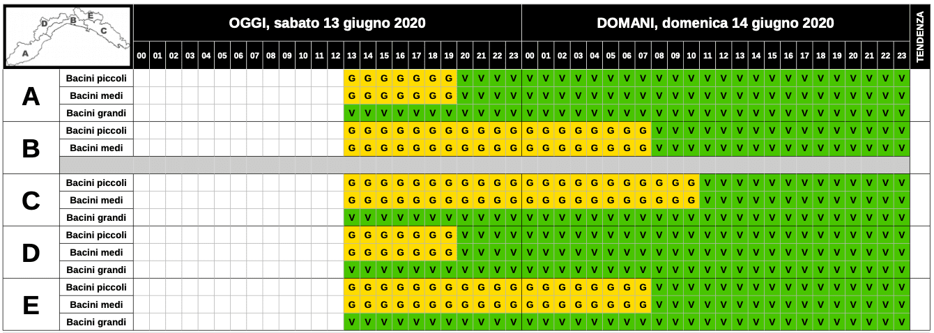 L’allerta gialla sul Centro-Ponente è scattata alle ore 6 nelle aree A, B e D e terminerà alle ore 20, ma è stata prolungata sul genovesato sino alle ore 8 di domani, domenica 14 giugno. Il fronte temporalesco si sposterà gradualmente verso Levante: infatti sulle zone C ed E l’allerta gialla si estenderà sino alle ore 11 di domenica mattina.