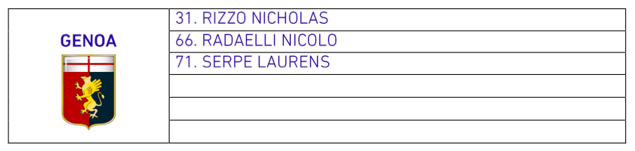 Rizzo, che aveva partecipato con Andreazzoli a larga parte del ritiro estivo del Genoa prima della cessione in prestito alla Carrarese, avrà il dorsale numero 31. Il compagno di reparto Serpe, tornato in estate dall’Inter Primavera, avrà invece il numero 71. Il portiere Radaelli, infine, ha scelto il numero 66: iniziata la stagione col Pescara Primavera, è tornato in inverno alla corte di mister Chiappino e da qualche tempo lavora sotto gli occhi di mister Nicola al centro sportivo “Signorini”. Nicolò Rovella manterrà il numero 65 col quale aveva esordito a San Siro con l’Inter, mentre Cleonise il 56 vestito all’esordio al San Paolo contro il Napoli.