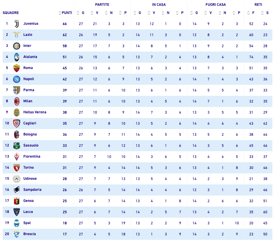 LA CLASSIFICA AL TERMINE DI INTER-SASSUOLO