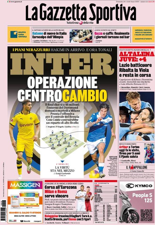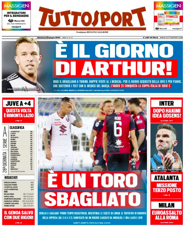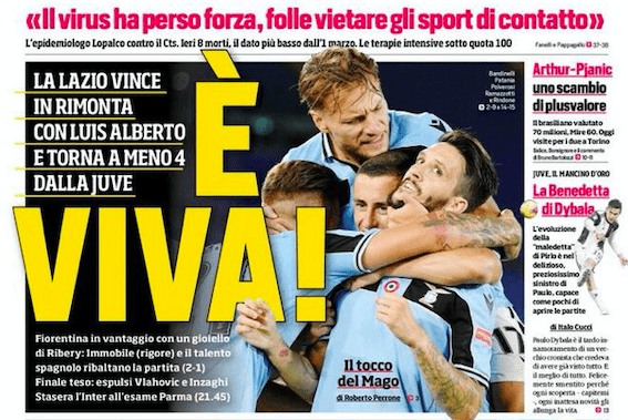 Prime pagine incentrate sulla vittoria in rimonta della Lazio contro la Fiorentina, non senza qualche polemica. I biancocelesti si ritrovano a -4 dalla Juventus e con un Luis Alberto in grande crescita. I bianconeri, prossimi avversari del Genoa (col dubbio Bentancur), attendono oggi l’arrivo di Arthur dal Barcellona per le visite mediche nello scambio con Pjanic, che vestirà blaugrana. Infine si accenna al poker calato dal Cagliari al Torino e del pareggio in rimonta del Genoa sul Brescia. Oggi si chiuderà il 28° turno con sei partite.