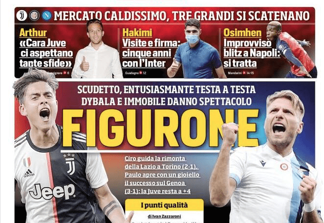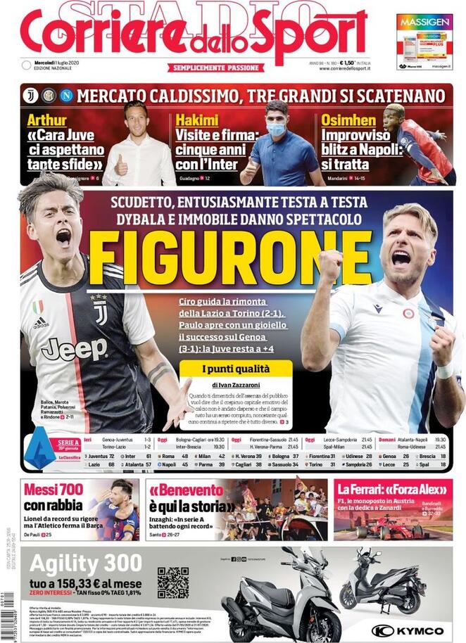 Arthur si presenta alla Juve, Hakimi firma per cinque anni con l’Inter, Osimhen atterra a Napoli per trattare con De Laurentiis. Tanto calciomercato nelle prime pagine dei quotidiani sportivi in un 1 Luglio all’insegna del campionato: dopo Torino-Lazio (“Toro da Serie B” titola Tuttosport) vinta dai biancocelesti e Genoa-Juventus dai bianconeri, oggi scendono in campo altre 12 squadre: si parte alle 19.30 con Bologna-Cagliari e Inter-Brescia, quindi spazio a Fiorentina-Sassuolo, Verona-Parma, Lecce-Sampdoria e SPAL-Milan.