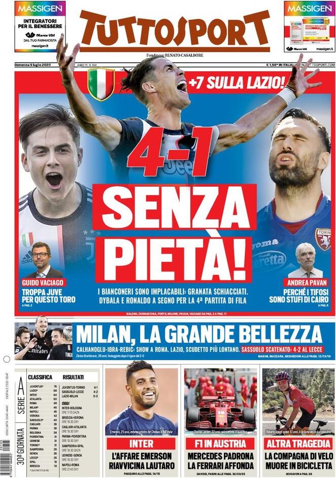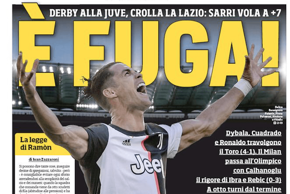 Le prime pagine dei quotidiani sportivi in edicola sono tutte per la Juventus di Sarri, che vince e scappa in classifica sfruttando il crollo della Lazio all’Olimpico contro un Milan trascinato da Ibra. L’Inter si avvicina e spera di riportare in Serie A Emerson Palmieri, Gattuso e il suo Napoli stasera tenteranno l’aggancio alla Roma di Fonseca, in piena crisi di risultati. La Fiorentina smentisce le indiscrezioni su De Rossi prossimo allenatore sulla panchina viola, definendole fake news.