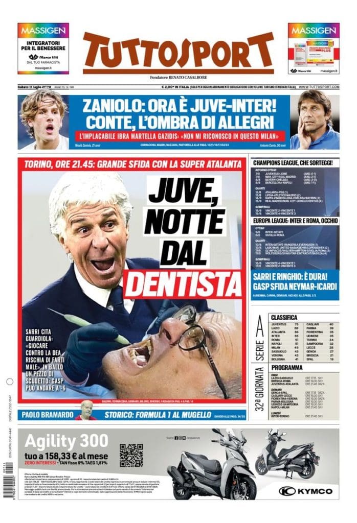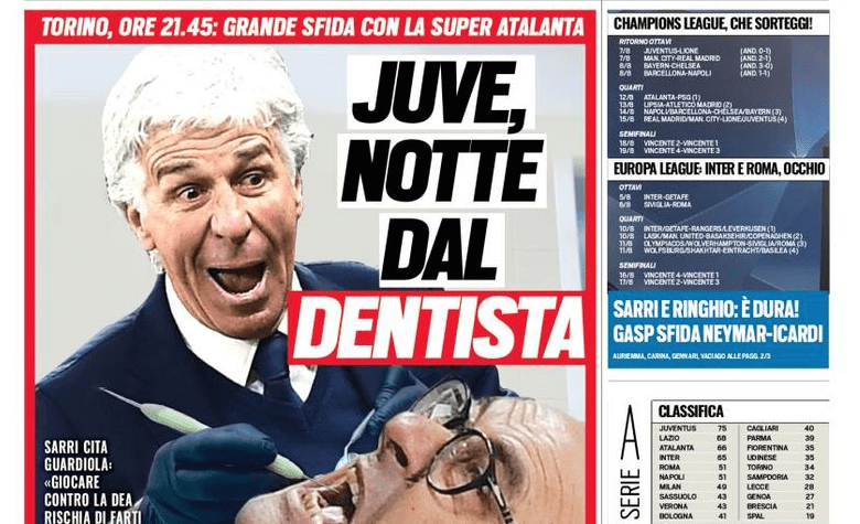 Prime pagine per Juventus-Atalanta, partita che potrebbe chiudere o riaprire la Serie A. Molto dipenderà anche dal risultato di Lazio-Sassuolo: Simone Inzaghi spera di tornare a -4 già nel pomeriggio, De Zerbi ha un’occasione per fare un balzo in piena zona Europa League. Secondo Tuttosport, che dedica un fotomontaggio alle parole di Sarri sulla squadra di Gasperini, è duello di mercato Juve-Inter per Zaniolo, mentre l’ombra di Allegri piomba clamorosamente su Conte. Il Corriere dello Sport aumenta il carico: il tecnico e l’Inter non erano mai stati così distanti, mentre da Suning trapela “forte irritazione”. La Gazzetta con Koulibaly: “Pronto a restare a vita a Napoli”.