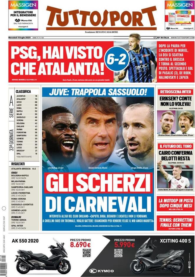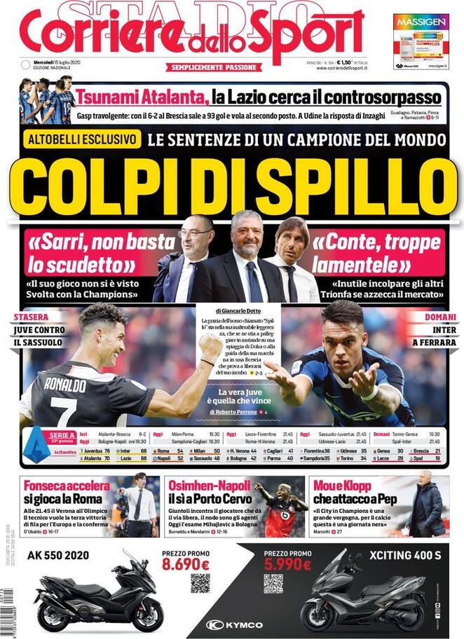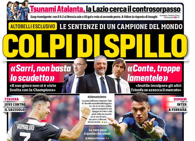 Sulle prime pagine di giornata spazio per il punteggio tennistico dell’Atalanta contro il Brescia, che la proietta momentaneamente al secondo posto in attesa di Inter e Lazio. I biancocelesti potranno rispondere stasera contro l’Udinese, l’Inter è attesa invece giovedì dal confronto contro la Spal. Interesse anche per la Juventus, he dovrà cercare di fare punti a Reggio Emilia contro un Sassuolo lanciato nella rincorsa ad un possibile ingresso ai playoff di Europa League.