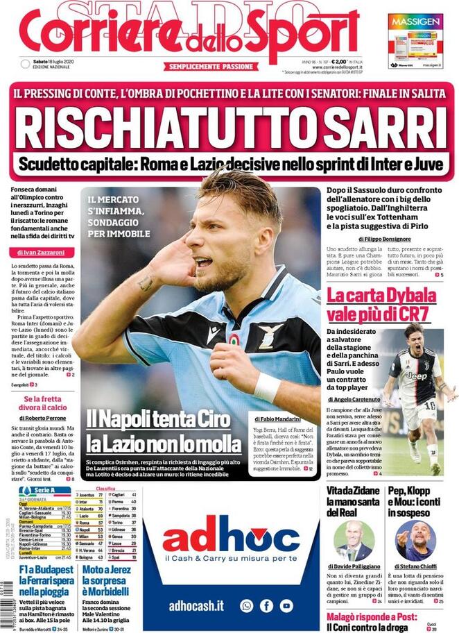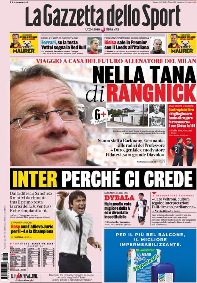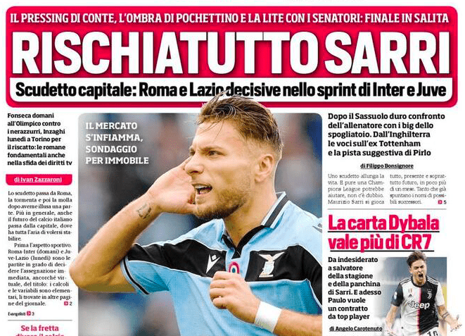 Prime pagine dedicate interamente alla corsa Scudetto, che si arricchisce di nuovi dettagli, oltre a quello di una Inter risalita a -6 dai bianconeri. Immobile è tentato dal Napoli, il Milan aspetta che Rangnick risolva il proprio contenzioso con la RedBull. Si parla anche di Dybala, una carta ancora più decisiva di CR7 in questo momento per le sorti della Juventus, il cui spogliatoio viene dato in fermento da alcuni quotidiani sportivi, con Sarri chiamato a vincere lo scudetto per non vedersi sfilare il posto da Pochettino, un’ombra sulla panchina bianconera.