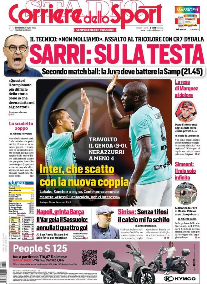 Sul fronte moviola, Massa prende la sufficienza per varie motivazioni. Intanto per il Corriere dello Sport non c’è fallo su Zapata da parte di Lukaku. Poi non sarebbe neppure da sanzionare col calcio di rigore il tocco di braccio di Gagliardini in contrasto con Pinamonti (“braccio alto giustificato perché il pallone sale e lo colpisce sotto il gomito: involontario“). Infine ci sono le pagelle, con pochissime sufficienze per il Genoa: le uniche sono di Romero e Jagiello (6), mentre il peggiore in campo risulta Criscito (“non è al top e si vede. Moses lo mette in chiara difficoltà e lo salta più volte. Prova ad arrangiarsi senza riuscirci“).