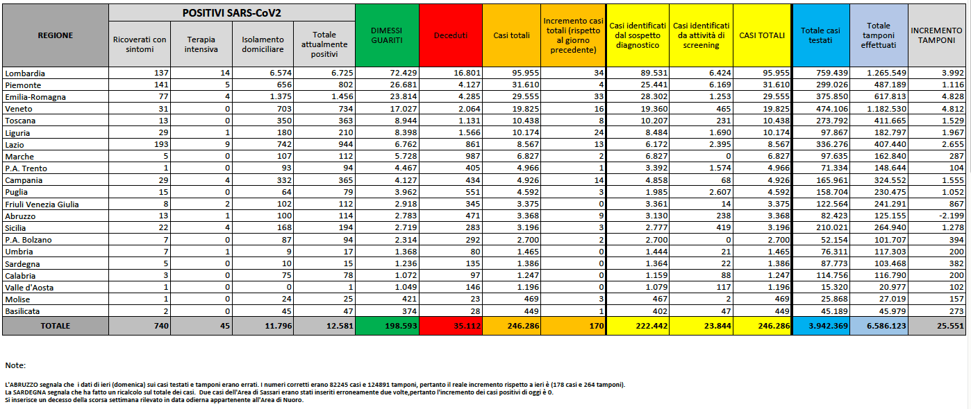 - Casi totali da inizio emergenza: 246.286 (+168 fra positivi, deceduti e guariti)