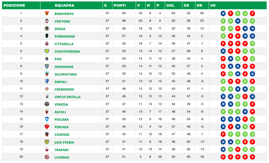 Ma non è finita qua l’analisi della 37° giornata di Serie B. Vittorie di misura per Chievo Verona e Pisa, che scattano in zona play-off assieme al Pordenone (1-1 contro la Salernitana). Per adesso hanno la certezza di giocarsi la terza promozione solo Spezia, Pordenone e Cittadella. L’ultimo turno disegnerà il quadro completo con le ultime tre squadre: se la giocano da virtualmente ammesse ai playoff Chievo, Pisa, Frosinone, mentre hanno ancora qualche chance di entrare dall’ottavo posto in su Empoli e Salernitana.