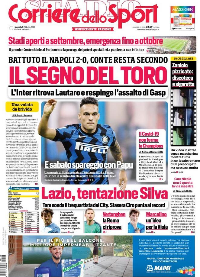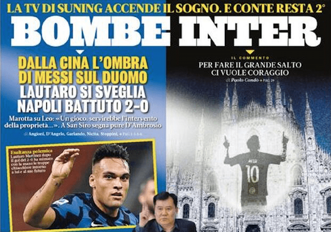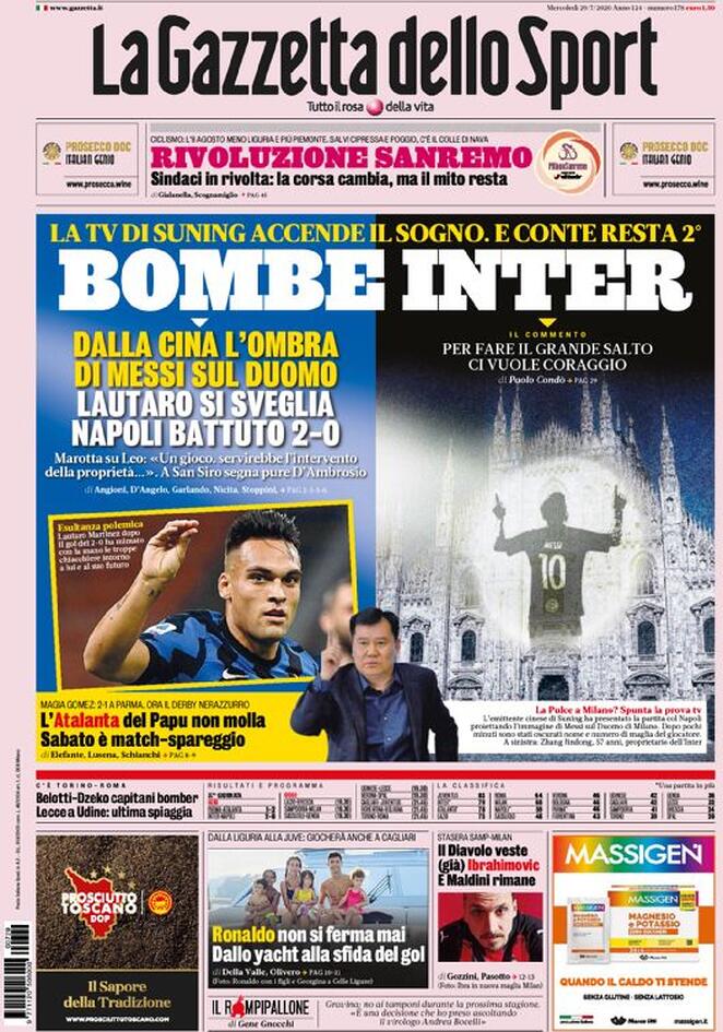 Prime pagine dedicate alla vittoria dell’Inter contro il Napoli, alla pay-tv gestita da Suning che proietta (in una locandina) l’ombra di Messi sul duomo di Milano, alla Juventus che chiude per Milik e al Milan che è pronto a confermare sia Maldini sia Ibrahimovic. La Lazio ci prova per David Silva, la Roma ci riprova per Vertonghen. A Firenze il dopo Iachini si chiama Marcelino?