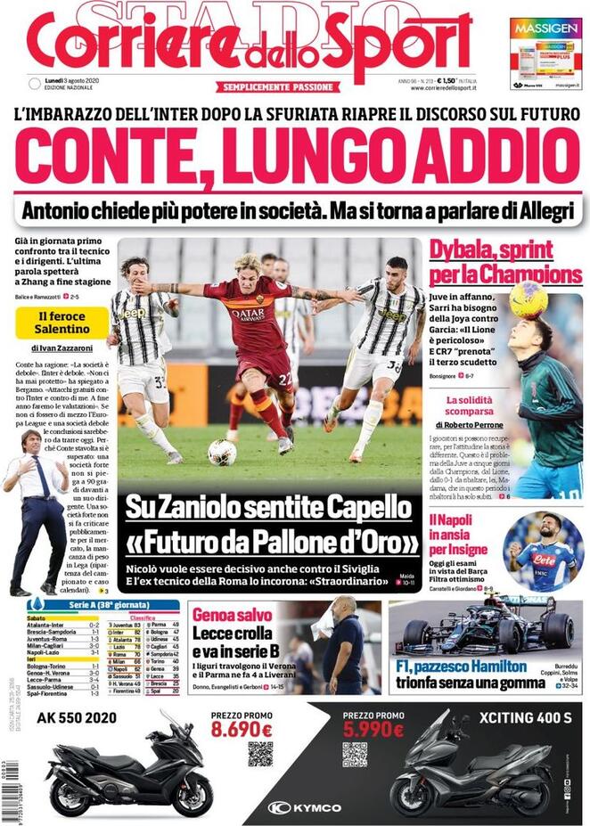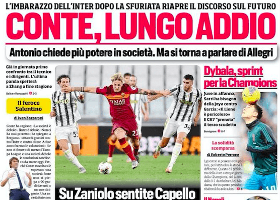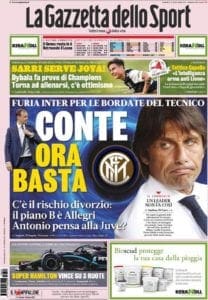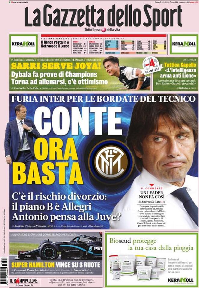 Poco spazio per la salvezza del Genoa e per la retrocessione del Lecce sulle prime pagine dei quotidiani sportivi, che parlano della fine della stagione, ma soprattutto delle parole di Antonio Conte che hanno destabilizzato l’atmosfera in casa Inter. Allegri potrebbe avvicendarlo sulla panchina nerazzurra? È la domanda che ci si pone questa mattina. Si intravedono anche i primi accenni di Champions League, considerato che la Juventus è attesa dal ritorno contro il Lione. Sarri potrebbe recuperare Dybala.