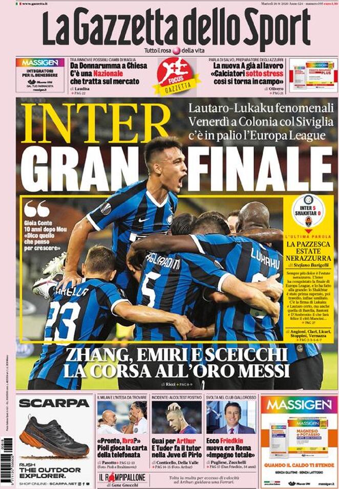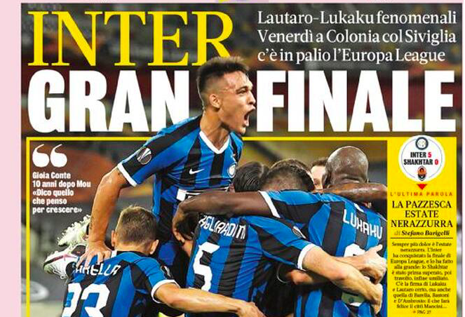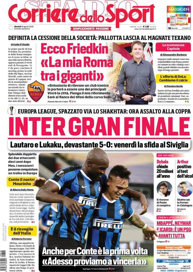 Le prime pagine della rassegna stampa di questo martedì 18 agosto parlando in primo luogo della vittoria dell’Inter contro lo Shakhtar Donetsk nella semifinale di Europa League. Successo che restituisce all’Italia una squadra nostrana in una finale di Europa League dopo addirittura ventuno anni. L’avversaria sarà il Siviglia. Spazio anche per la cessione, ora ufficiale, della Roma, passata da James Pallotta a Dan Friedkin. Stasera Lipsia-PSG, la prima semifinale di Champions League.