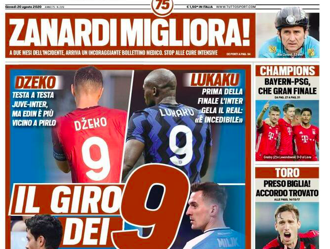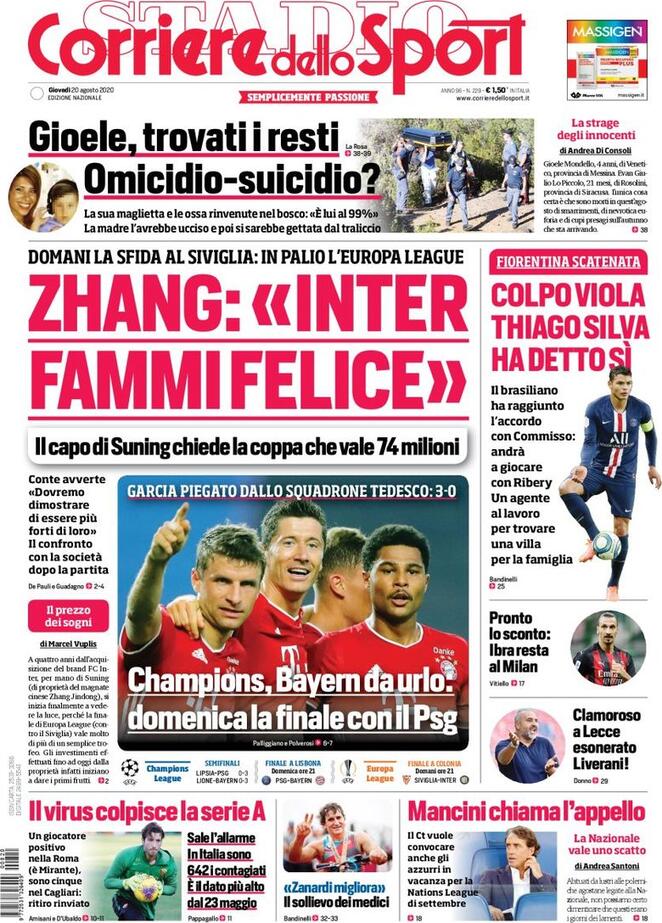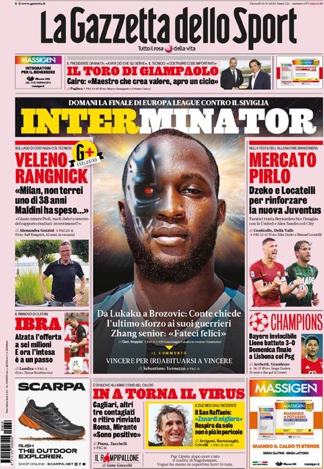 “In A torna il virus” è uno dei titoli che più allarmano in questa rassegna stampa del giovedì, considerato che il campionato inizierà tra meno di un mese e alcune squadre, come il Cagliari, sono già state costrette ad annullare il proprio ritiro per 4 casi di positività. Non è l’unico tema in risalto, perché si assottigliano le ore che ci dividono dalla finale di Europa League fra Inter e Siviglia, in programma domani. Zhang chiede a Conte un successo, affidandosi anche ad “Interminator“, soprannome affibbiato dalla Gazzetta a Lukaku. Nel frattempo il Bayern Monaco centra la sua 11° finale di Champions League: sfiderà il PSG, dal quale potrebbe congedarsi a fine stagione Thiago Silva per andare alla Fiorentina.