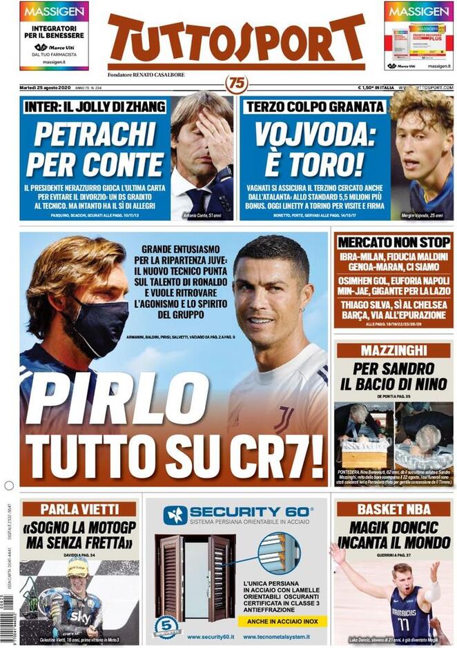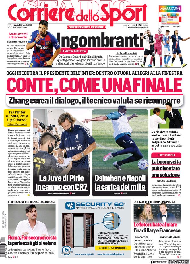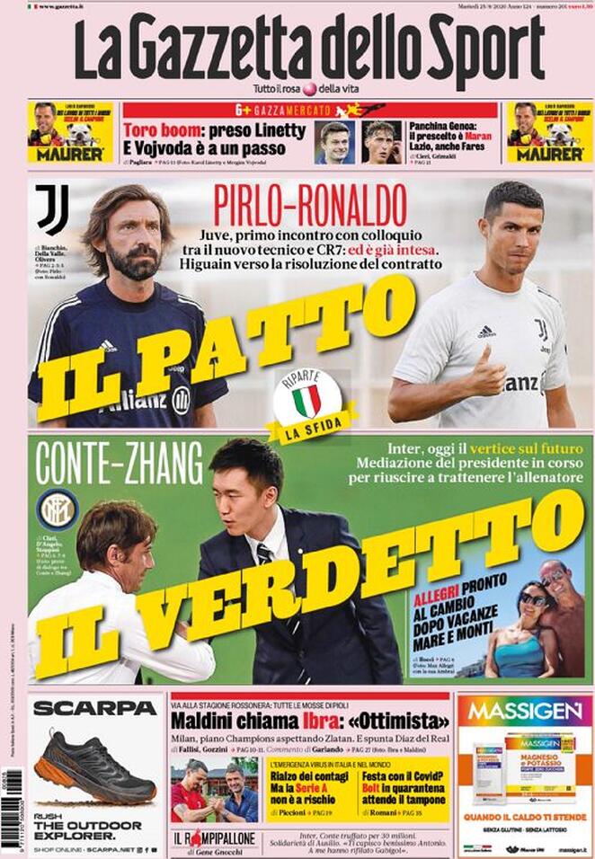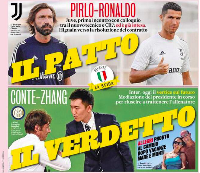 Le prime pagine dei quotidiani sportivi giocano sul doppio filo di Inter e Juventus. I nerazzurri oggi incontrano Antonio Conte per definire il suo futuro, con Zhang che avrebbe pronta la carta Allegri in caso d’addio, ma vorrebbe provare a giocarsi il jolly chiamato Petrachi. La Juventus invece ha ripreso gli allenamenti con Dybala ancora ad Ibiza e Cristiano Ronaldo in piena forma. Prima seduta diretta da Andrea Pirlo. Spazio anche per la prima uscita ufficiale di Oshimen col Napoli nel ritiro di Castel di Sangro e per l’imminente addio di Luis Suarez al Barcellona, che lascerà privo di squadra uno dei bomber più forti del mondo del calcio.