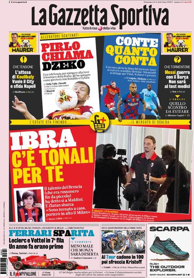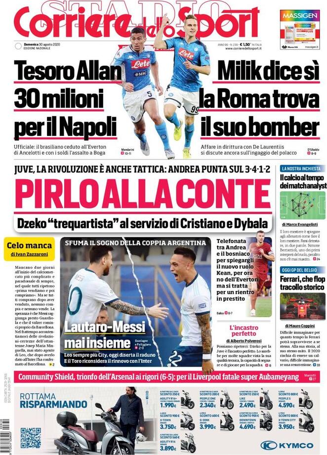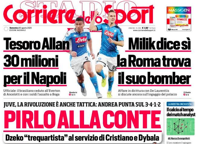 Le prime pagine di questa domenica di fine agosto sono infarcite di calciomercato. La Juventus registra attraverso Tuttosport la spinta di Luis Suarez per approdare in bianconero, mentre Tonali si avvicina al Milan (dove ha fatto ritorno anche Ibrahimovic). Allan volerà alla corte di Ancelotti all’Everton, Milik avrebbe detto sì alla corte della Roma, pronta a liberare Edin Dzeko direzione Juventus.