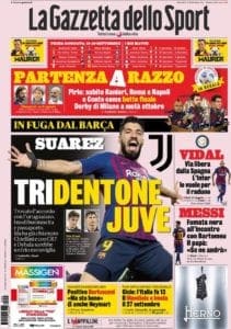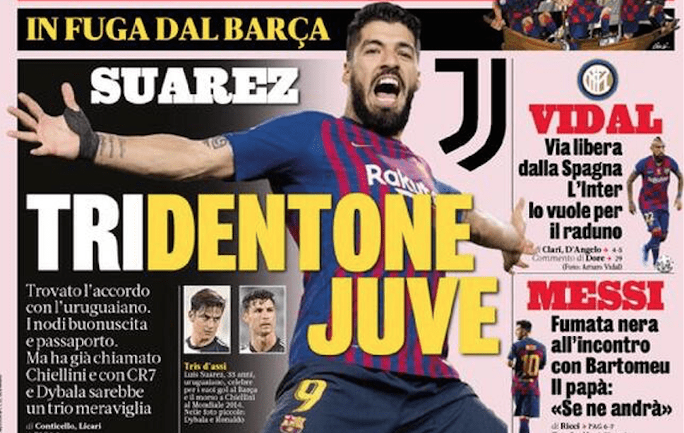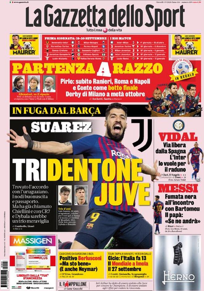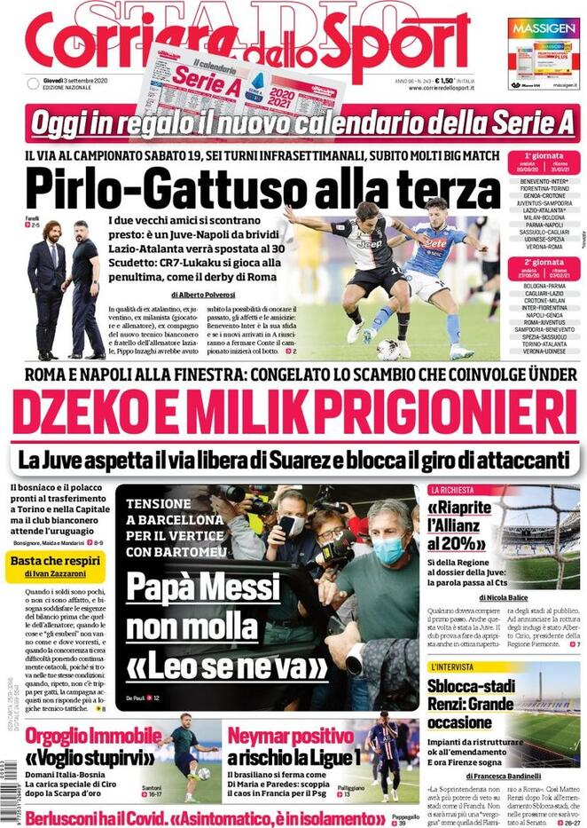 Prime pagine dedicate ai calendari del campionato 2020/2021 e ai movimenti di mercato, soprattutto quelli che vedono coinvolta la Juventus di Pirlo: si avvicina Suarez mentre si blocca il giro di attaccanti che avrebbe visto Dzeko con la maglia bianconera e Milik con quella della Roma. L’Inter aspetta Vidal e accoglie Kolarov, il City ha pronti 700 milioni per convincere Messi, che a sorpresa potrebbe restare controvoglia a Barcellona. Il Milan ha chiuso per Tonali e Brahim Diaz ma non molla pure Bakayoko, il Torino di Giampaolo cerca anche Ferrari e Torreira. 18 casi di Coronavirus nel Boca Juniors, in Ligue 1 positivo anche Neymar: Ligue 1 a rischio?