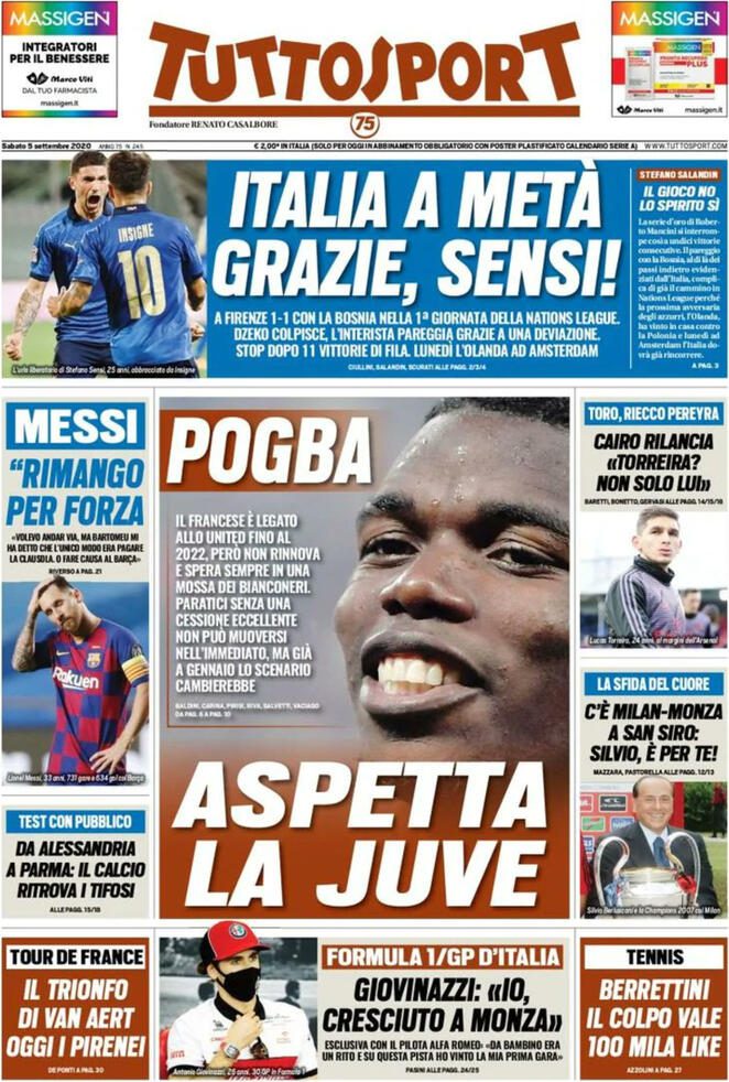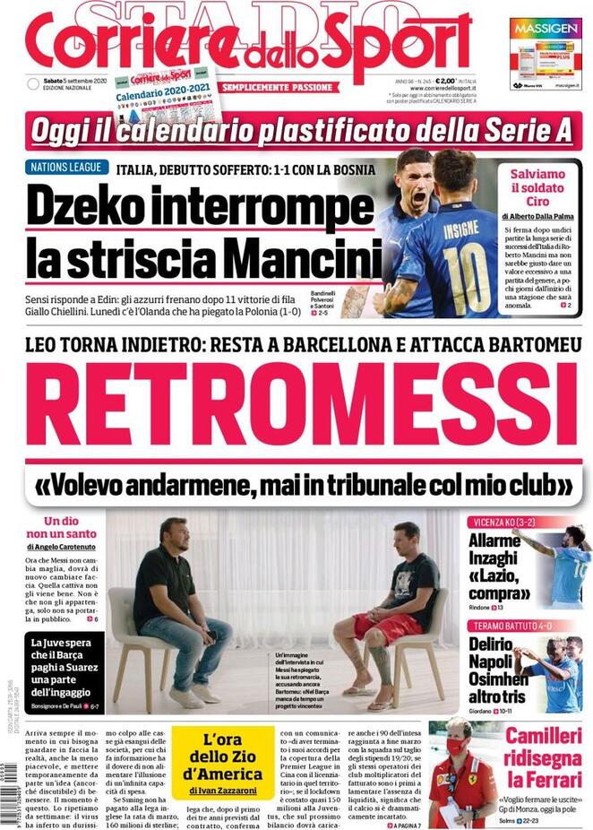 L’Italia pareggia a Firenze contro la Bosnia di Edin Dzeko, che ferma con un gol la striscia vincente di Roberto Mancini. Lunedì c’è l’Olanda, che ha battuto 1-0 la Polonia. Leo Messi fa marcia indietro e conferma: resterà al Barcellona un altro anno. La Juventus aspetta Pogba e spera che il Barça paghi parte dell’ingaggio a Luis Suarez, che resta il primo obiettivo dietro proprio all’attaccante della Roma, in rete ieri sera al Franchi. Il Toro prova a chiudere per Torreira e Pereyra.