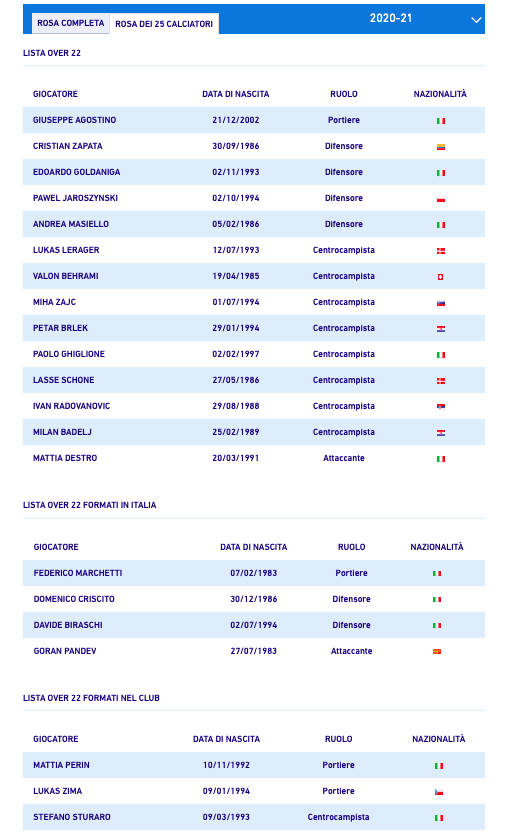 Nella prima categoria figurano Zapata, Goldaniga, Jaroszynski, Masiello, Lerager, Behrami, Zajc, Brlek, Ghiglione, Schöne, Badelj, Destro, Radovanovic. Inserito anche Agostino, classe 2002 che si allena da settimane con la prima squadra, che l’anno scorso ha giocato stabilmente nell’Under 18 di Ruotolo (e che sta giocando proprio in questi minuti in porta con la Primavera a Begato 9, ndr ). Assente Jagiello, attualmente in Polonia per alcuni accertamenti. Inizialmente, in questa lista non figuravano neppure i due neo ufficializzati (Pjaca e Zappacosta), Parigini e il laterale destro Ankersen. Ad eccezione di Parigini, gli altri tre elementi della rosa sono stati inseriti prima fra i convocati di Genoa-Crotone, poi in lista, a dimostrazione di quanto conti relativamente la lista prima del 5 ottobre, gong del calciomercato.