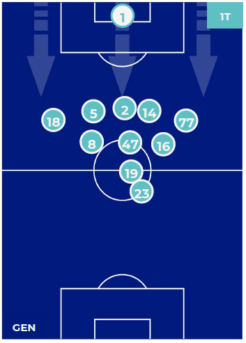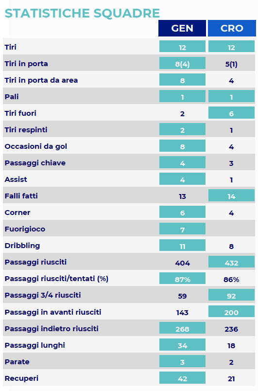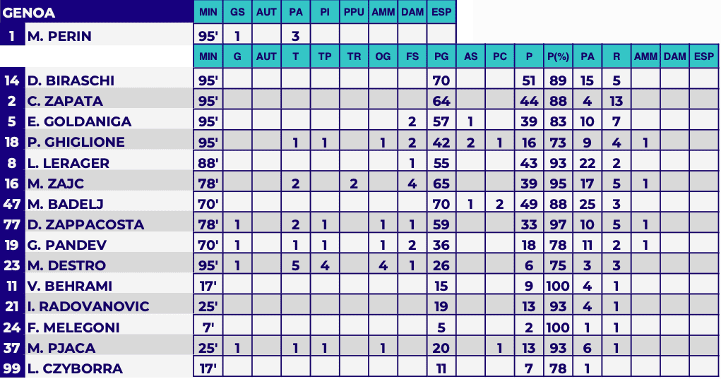 A tessere le trame offensive e di conduzione del gioco era la prima uscita di Milan Badelj, mai più di due tocchi e pallone sempre smistato con precisione. Ha giovato del lavoro ai suoi fianchi di Lerager e Zajc, entrambi generosi in copertura così come in fase offensiva. Nel finale avrebbe lasciato il posto a Radovanovic, che ai fianchi si è trovato Melegoni e Behrami. Con 70 palloni giocati, il regista croato è stato il rossoblu più cercato dalla squadra assieme al capitano Biraschi, mentre Zappacosta è risultato il rossoblu con la migliore percentuale tra passaggi tentati e riusciti (97%). Infine, interessanti i dati sul chilometraggio che raccontano come Biraschi sia stato l’uomo ad aver corso di più (10,52 km) seguito da Destro (10,46), il doppio assistman Ghiglione (10,39), Goldaniga (10,12) e Zajc (9,87).