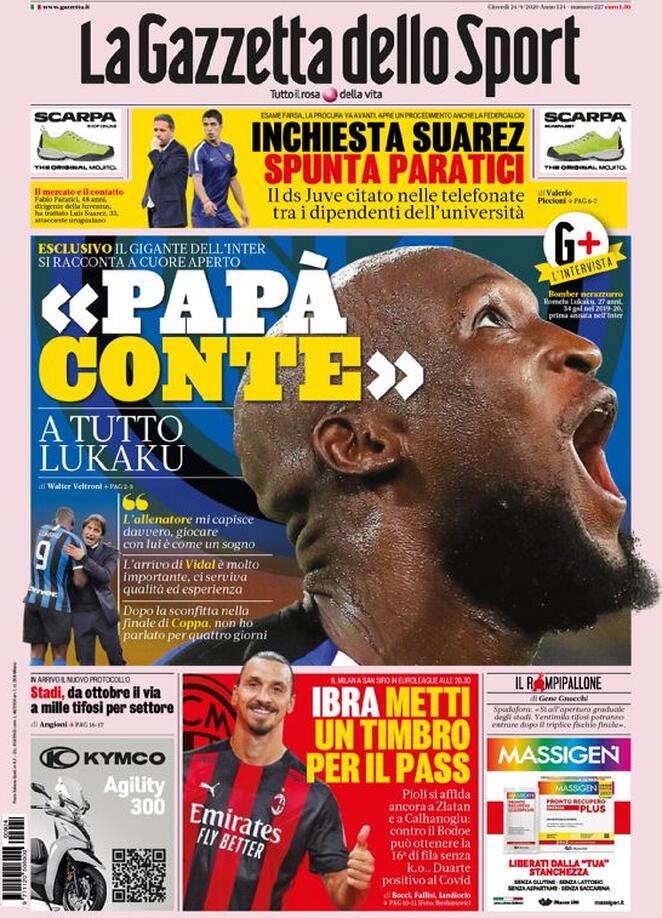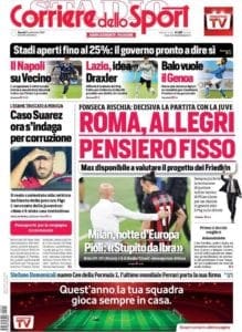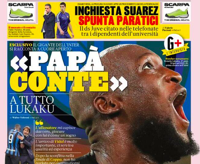 Prime pagine interessate in modo particolare all’inchiesta sull’esame di italiano “farsa” al quale si è sottoposto Luis Suarez, da quest’oggi ufficialmente nuovo giocatore dell’Atletico Madrid. Le ultime intercettazioni potrebbero vedere coinvolto anche Paratici, come riporta la Gazzetta dello Sport, e la stessa FIGC avrebbe aperto un’inchiesta. Spazio anche al mercato, col possibile ritorno di Allegri sulla panchina della Roma e l’Inter che vuole anche Kantè. Vera possibile alternativa a Torreira se il Torino non riuscisse ad arrivare al regista ex Sampdoria. Questa sera il turno eliminatorio del Milan in Europa League col Bodo/Glimt.