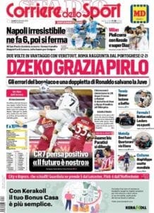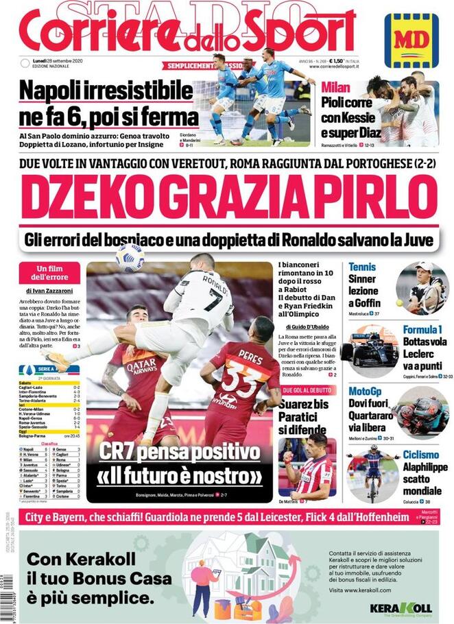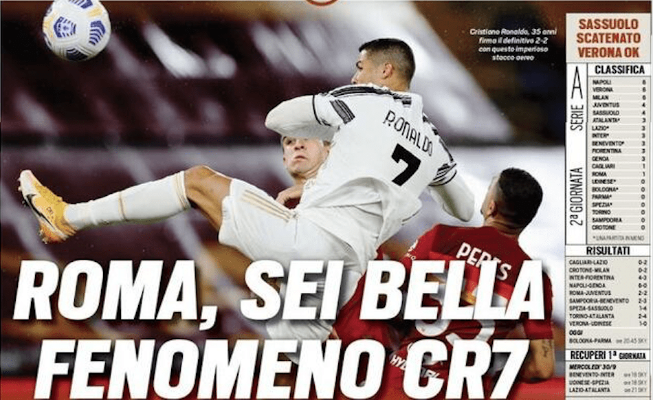 Una Roma “bella” viene fermata sul pareggio dalla Juve del “fenomeno” Cristiano Ronaldo, autore di una doppietta così come il giallorosso Veretout: all’Olimpico finisce 2-2. Senza Ibrahimovic, ci pensa Brahim Diaz e il Milan (che perde Rebic per infortunio) sale in vetta insieme a Verona e Napoli. Gli Azzurri sono una valanga contro il Genoa: fanno 6 gol e poi si fermano. L’Inter sogna Kante, il Sassuolo è scatenato nell’esordio con lo Spezia, il Toro di Cairo non spende? “Povero Vagnati, ds senza portafoglio” scrive Tuttosport. Questa sera in campo Bologna e Parma.