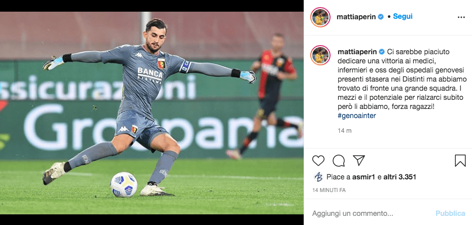 “Ci sarebbe piaciuto dedicare una vittoria ai medici, infermieri e agli operatori socio-sanitari degli ospedali genovesi presenti stasera nei Distinti, ma abbiamo trovato di fronte una grande squadra”. Lo scrive Mattia Perin, sui social, dopo la sconfitta incassata contro l’Inter al Ferraris di Genova. Il portiere del Genoa aggiunge: “I mezzi e il potenziale per rialzarci subito però li abbiamo, forza ragazzi!”. Questo pomeriggio le porte dello stadio si sono riaperte per un migliaio di tifosi genoani, fra i quali anche molti operatori sanitari, in prima linea nella lotta contro il Coronavirus (clicca qui).