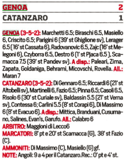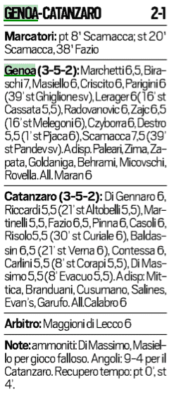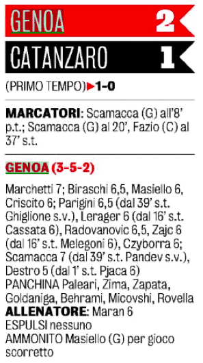 Le pagelle del Secolo XIX: Marchetti (6,5) – Biraschi (6) – Masiello (6,5) – Criscito (6) – Parigini (6) – Lerager (6) Ghiglione (6) – Cassata (6) – Radovanovic (6) – Zajc (6) – Melegoni (6,5) – Czyborra (6) – Destro (5) – Pjaca (5,5) – Scamacca (7,5) – Pandev (senza voto) – Maran (6,5)