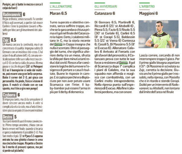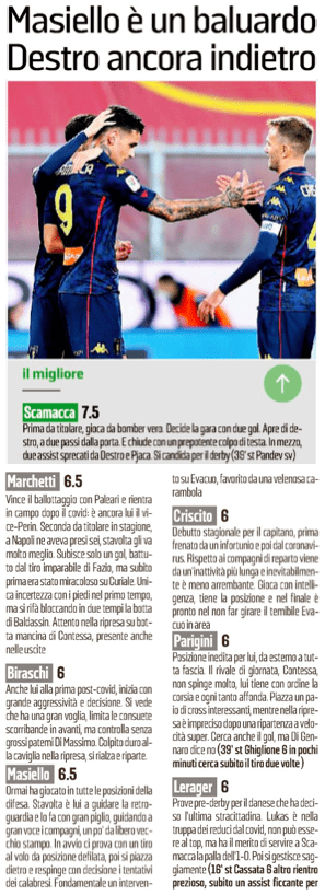 Le pagelle della Gazzetta dello Sport: Marchetti (7) – Biraschi (6,5) – Masiello (6) – Criscito (6) – Parigini (6,5) – Lerager (6) Ghiglione (senza voto) – Cassata (6) – Radovanovic (6,5) – Zajc (6) – Melegoni (6) – Czyborra (6,5) – Destro (5) – Pjaca (6) – Scamacca (7) – Pandev (senza voto) – Maran (6)