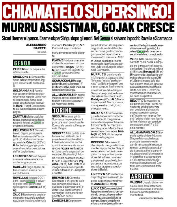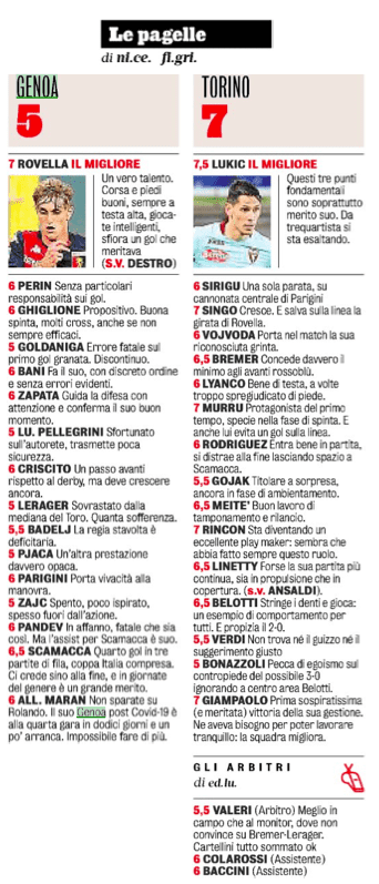 Perin (6) – Ghiglione (6) – Goldaniga (5) – Bani (6) – Zapata (6) – Pellegrini (5) – Criscito (6) – Lerager (5) – Badelj (5,5) – Rovella (7) – Destro (senza voto) – Zajc (5) – Pandev (6) – Pjaca (5) – Parigini (6) – Scamacca (6,5) – Maran (6)