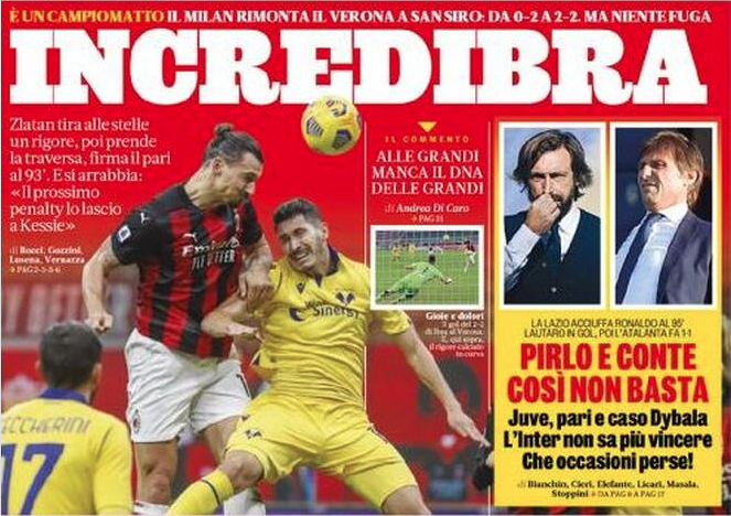 Prime pagine per i gol che sono valsi vittorie o rimonte, come quella del Milan nel posticipo contro il Verona di Juric. “Il Napoli è in volo come Osimhen” titola il Corriere dello Sport, la Gazzetta si divide fra una lode ad Ibrahimovic (che prima di segnare aveva tirato un rigore alle stelle) e un appunto per Conte e Pirlo: “Così non basta”. L’allenatore dell’Inter chiede di “togliere il vino da tavola” a chi sostiene che la sua squadra non abbia furore agonistico, mentre in casa bianconera “scoppia il caso Dybala”. Entrato a partita in corso contro la Lazio, l’argentino ha commesso un errore imperdonabile poco prima del pareggio di Caicedo. A proposito di Lazio, sarebbero di epidemia colposa, falso e frode le accuse per il laboratorio di Avellino chiamato a processare i tamponi effettuati dal gruppo-squadra biancoceleste. Nel frattempo alcune Asl hanno bloccato la partenza dei giocatori convocati in nazionale: secondo Gazzetta e Tuttosport lo stop coinvolgerà solamente tesserati di Inter, Lazio e Fiorentina, mentre sul Corriere dello Sport viene inserito anche il nome del Genoa.