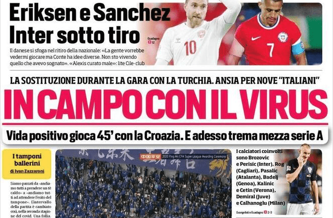 Nella prima pagina del Corriere dello Sport viene ripresa la vicenda della nazionale croata, costretta a sostituire Domagoj Vida a partita in corso poiché risultato positivo al tampone effettuato in vista della partita successiva, quella che si giocherà domani contro la Svezia. Fra i calciatori ad aver giocato insieme o vicino al difensore, diversi militano nella nostra Serie A. Fra questi c’è anche il genoano Milan Badelj. Nella giornata odierna, come comunicato dalla federcalcio della Croazia, tutta la squadra svolgerà ulteriori test a Stoccolma. Nel frattempo il presidente del Cagliari invoca la sospensione degli stage con le nazionali e delle partite di Nations League.
