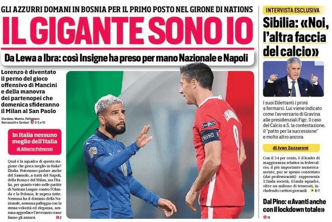 La Serie A punta ai controlli centralizzati per tutte le squadre: SynLab è in vantaggio su FederLab e LifeBrain, ma prima in assemblea di Lega Calcio bisognerà sancire l’accordo con il consorzio di fondi CVC-Advent-Fsi. Insigne è diventato il perno e un gigante nella Nazionale di Mancini, che si gode un Belotti decisivo non solo in maglia granata. Il Corriere dello Sport intervista Cosimo Sibilia, Tuttosport con Massimo Moratti, Joao Pedro, Marlon e Josip Ilicic. Capitolo calciomercato: l’Inter vuole Xhaka dell’Arsenal, a propria volta interessato ad Eriksen.