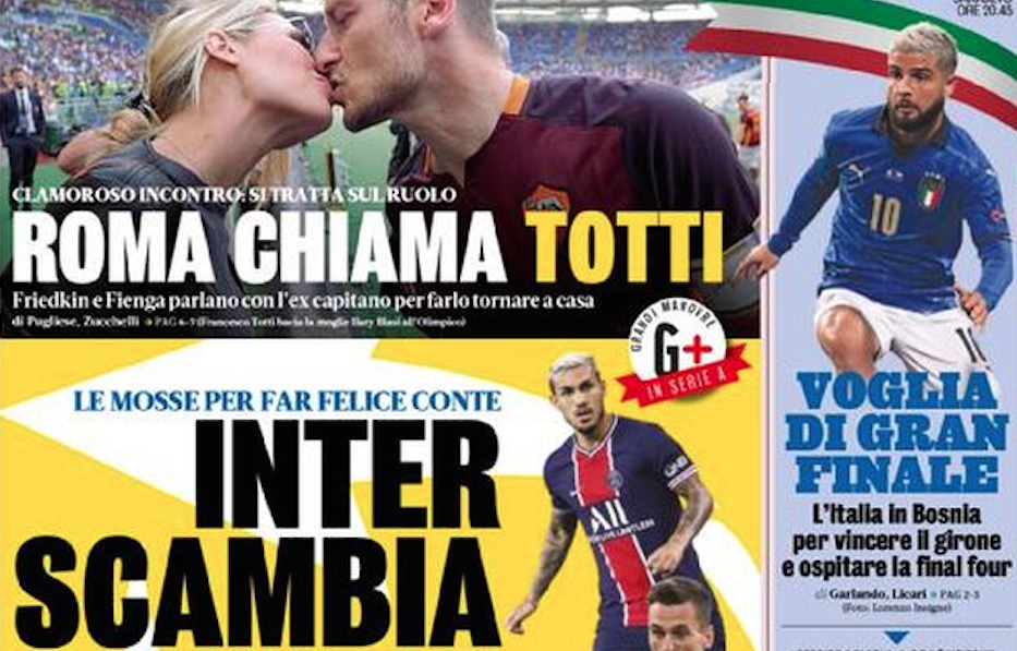 Paris Saint-Germain e Manchester United fanno la corte a Roberto Mancini, commissario tecnico della Nazionale che questa sera si gioca il primo posto nel girone contro una Bosnia-Erzegovina decimata. Kolarov è il decimo caso di Covid nell’Inter di Conte, che in vista del mercato di gennaio avrebbe già imbastito una serie di scambi: Eriksen per Paredes con il PSG, Vecino per Milik con il Napoli. La Juve è in corsa per accaparrarsi Alaba del Bayern Monaco, la Lazio ritrova Immobile, la Roma chiama Totti di nuovo per un posto in dirigenza? In Nations League fa rumore il 6-0 inflitto dalla Spagna alla Germania, ora fuori dalla final four della competizione.