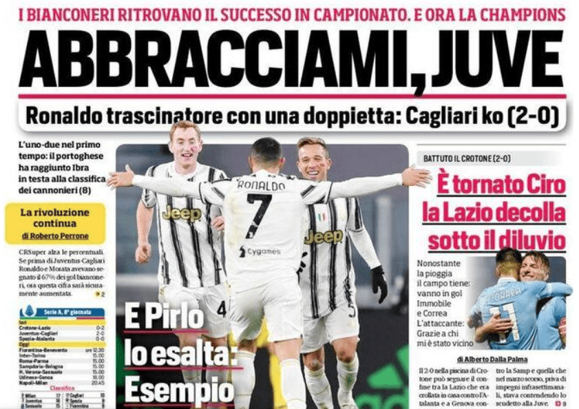 Cristiano Ronaldo è trascinatore nella vittoria della Juventus in casa contro un Cagliari privo di Nandez e Godin. La Lazio decolla sotto il diluvio a Crotone, nuovi casi di Covid-19 nel Torino, che questo pomeriggio affronta l’Inter di Conte: Sanchez affiancherà Lukaku, “Eriksen ha già avuto spazio” sostiene l’allenatore nerazzurro. L’Atalanta sbatte contro lo Spezia, capace di fare sempre meglio partita dopo partita. Prandelli torna sulla panchina del Franchi: l’ultima volta, nella sua ultima partita nel campionato di Serie A, era stata alla guida del Genoa.