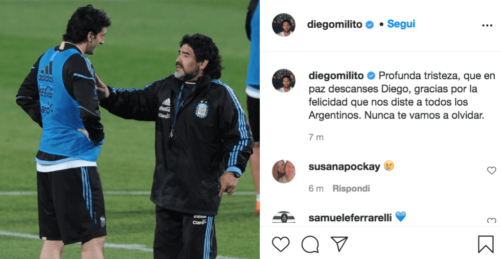 Anche Diego Alberto Milito ha ricordato Diego Armando Maradona, nel giorno della sua scomparsa all’età di 60 anni, con un messaggio pubblicato sui social. El Principe, leggenda prima che dell’Inter anche del Genoa, l’ultima volta che ha riabbracciato il Ferraris da spettatore è stata proprio in occasione di una partita contro il Napoli, squadra unita da un amore viscerale per Maradona tanto da colorare di nero lo stemma sui suoi canali ufficiali in segno di lutto. “Profonda tristezza – scrive Milito, svincolato da quando nei giorni scorsi ha abbandonato la carica di segretario tecnico del Racing Avellaneda – Diego, riposa in pace. Grazie per la felicità che hai regalato a tutti gli argentini. Non ti dimenticheremo mai”.