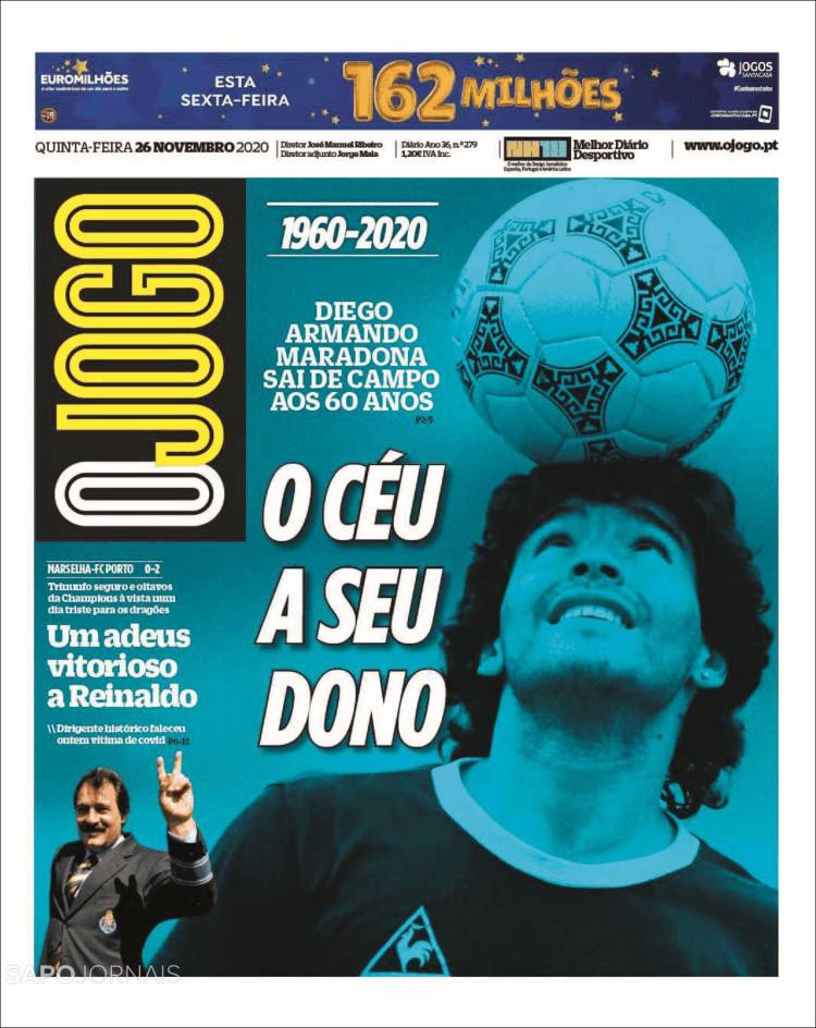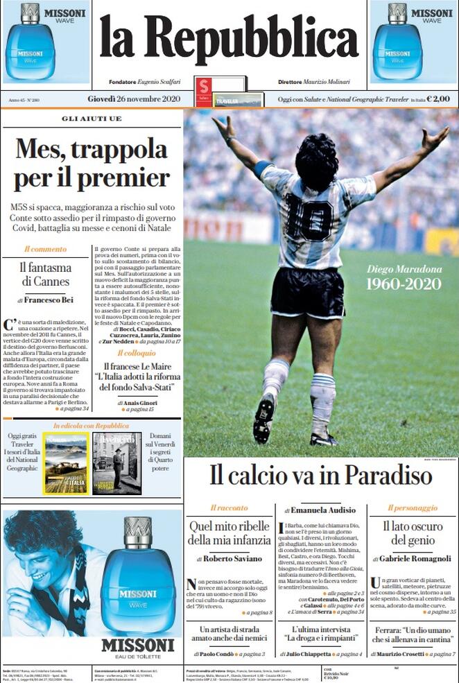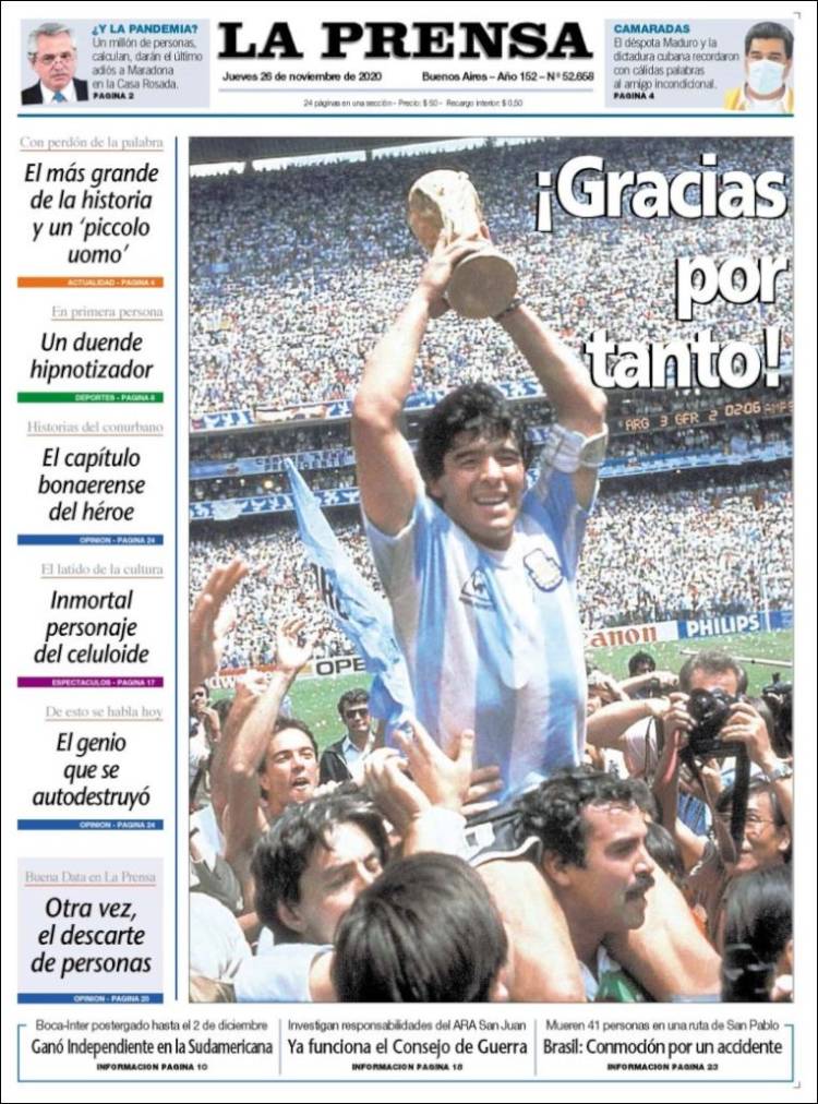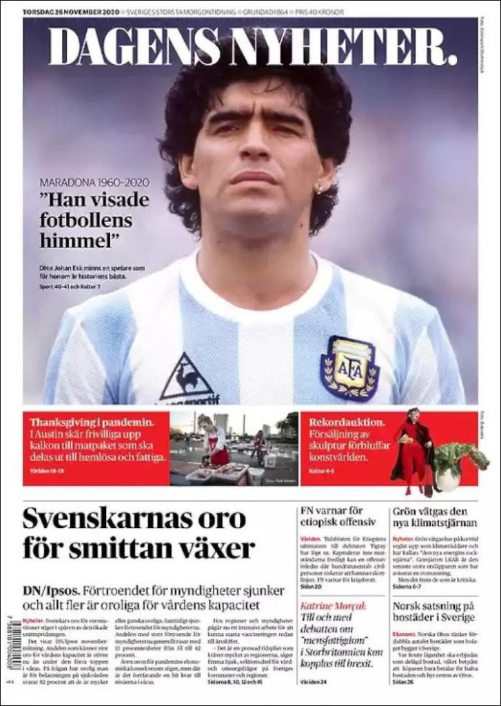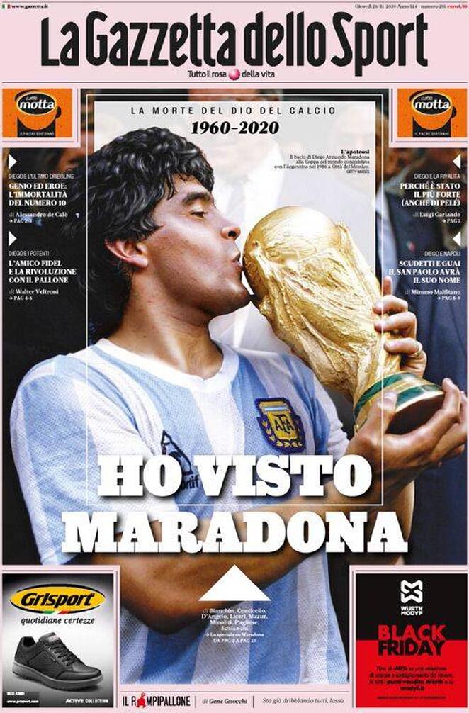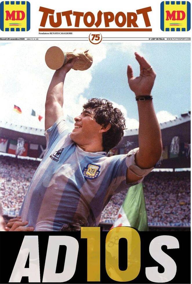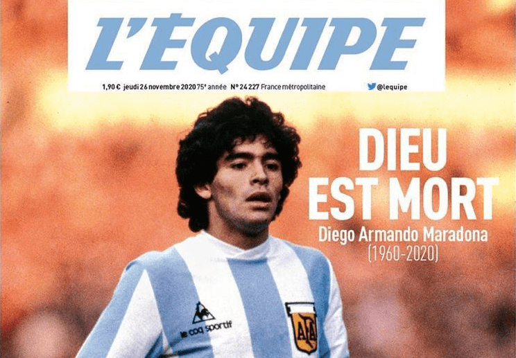 Le prime pagine dei quotidiani di tutto il mondo, non solo quelli sportivi, sono per Diego Armando Maradona. Scomparso nella giornata di ieri all’età di 60 anni, El Pibe de Oro è stato ricordato in lungo e in largo sui giornali: “Dio è morto” il titolo de L’Equipe e di AS, “celebriamo la vita di un dio” è l’annuncio del portoghese Record, “dio ha di nuovo la sua mano” si legge sul MorgenPost, “A milioni piangono la morte di Maradona” l’apertura del Times di Londra, “non ci sarà mai nessuno come lui” sentenzia il Clarìn, il quotidiano che per primo nella giornata di ieri ha dato la notizia del decesso di Maradona.