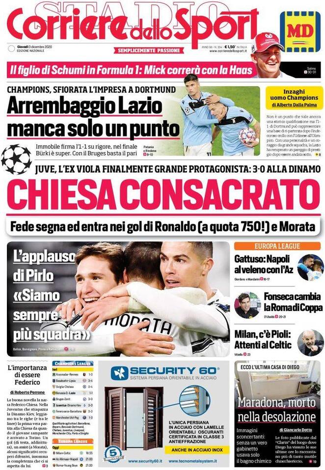 Prime pagine per le italiane impegnate in Champions League: Lukaku in versione “incredibile Hulk” fa sperare l’Inter nella qualificazione, già raggiunta da una Juventus che si gode un “Chiesa consacrato” contro la Dinamo Kiev. Ancora in ballo Atalanta e Lazio, cui basterà un pareggio nell’ultima giornata della fase a gironi. Oggi Roma, Napoli e Milan sono impegnate in Europa League.