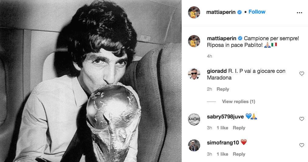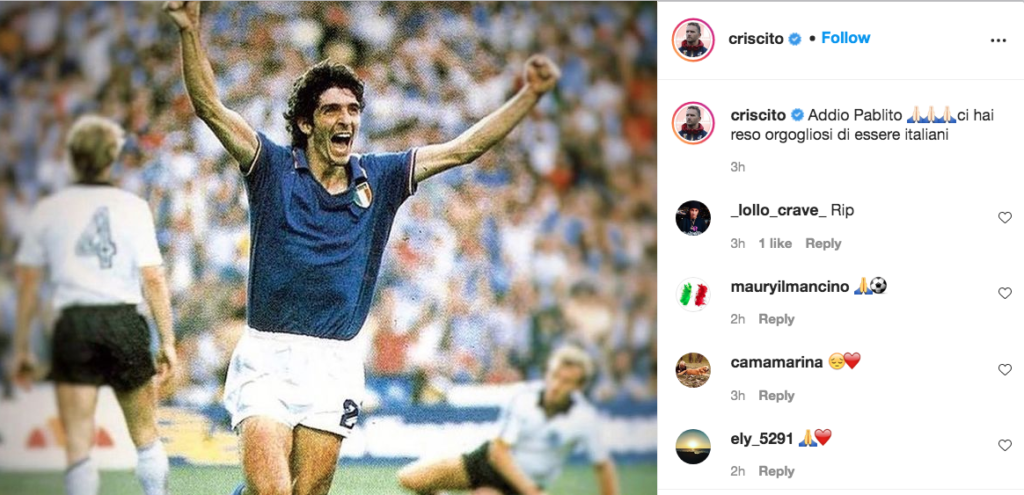 Tantissimi messaggi piovono dal mondo del calcio: “Ciao Paolo…i giocatori non dovrebbero andarsene prima degli allenatori” è il pensiero di Giovanni Trapattoni, che ha fatto il giro del web così come quello di Zbigniew Boniek: “Lo ammetto, piango. Facevi parte del gruppo di amici veri…con te non solo ho vinto ma ho anche vissuto”. “Non so cosa dire, è stato fulmine a ciel sereno” Dino Zoff all’Ansa. Dalla FIFA alla UEFA, dalla Nazionale a Mancini, tutti piangono la scomparsa di Pablito: “Il mondo del calcio perde un’altra vera leggenda, un simbolo, un altro grandissimo calciatore. Riposa in pace Paolo Rossi”.