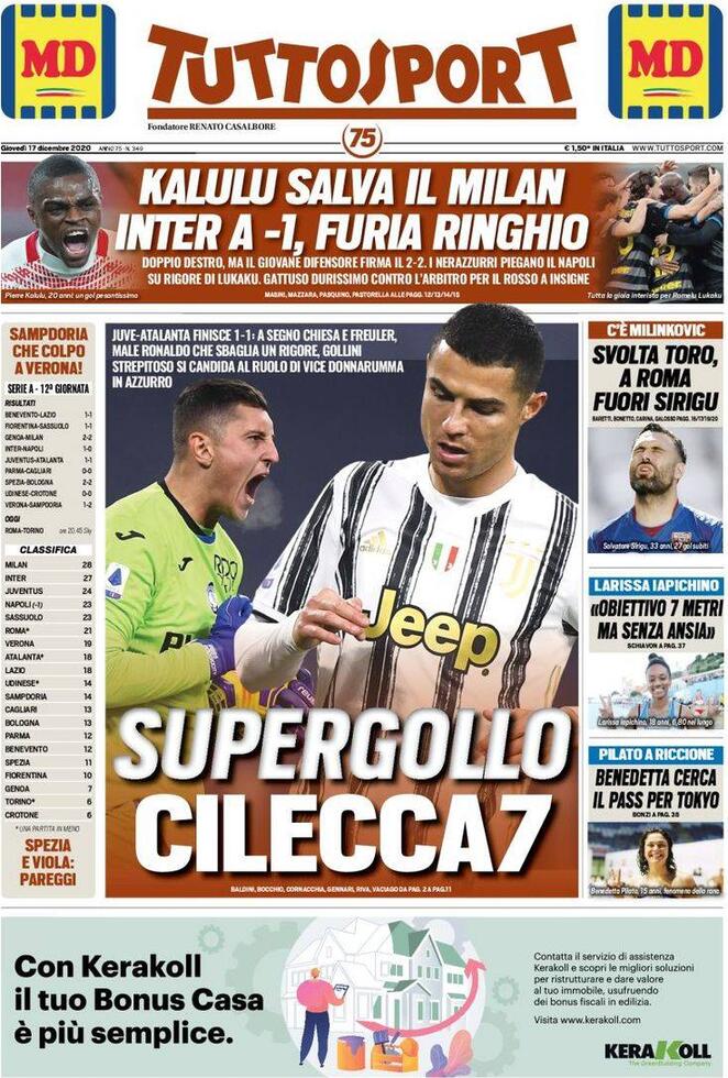 TUTTOSPORT – Destro regala a un Genoa “vivo” una “straordinaria doppietta” che mette forse fine alla fuga del Milan. Le assenze si fanno sentire, i rossoneri riescono ad acciuffare per due volte i rossoblu ma restano imbattuti. Senza Ibrahimovic “è mancato un piano B” si legge sul quotidiano torinese, che poi sottolinea come il pari sia tanto “linfa vitale” quanto un risultato che lascia del rammarico. Difesa milanista “svagata e disattenta” in occasione del primo gol genoano. E Pioli sottolinea: “Prendiamo troppi gol”. L’ago della bilancia? È stato Ghiglione. Cairo pensa a Ballardini in caso di esonero di Giampaolo, ma su di lui è in pressing da prima il Genoa. L’altra opzione è Nicola, che però dovrebbe liberarsi dal contratto che lo lega ancora ai rossoblu. “Qualcuno dovrebbe saldarlo – si legge – Ne avrebbe voglia Preziosi o più astutamente chiederebbe aiuto allo stesso Cairo?”.