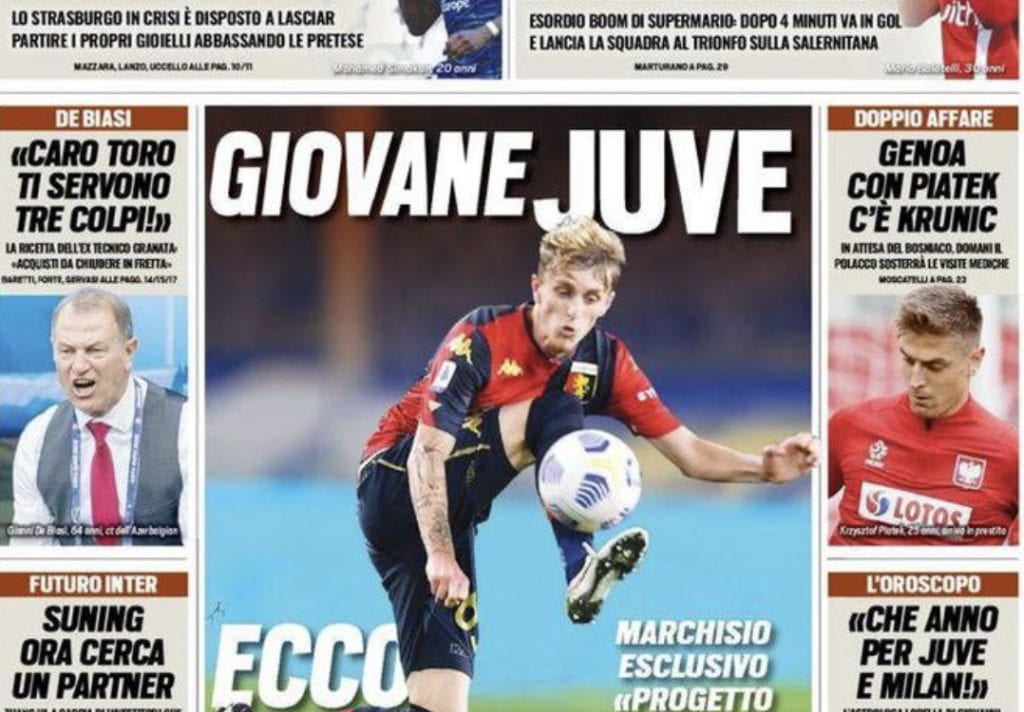 TUTTOSPORT – Chiude come sempre Tuttosport, che ha molto rossoblu sin dalla prima pagina. “Ecco Rovella” è il titolo scelto per trattare della tematica relativa al centrocampista, per il quale la trattativa non è chiusa ma in “dirittura d’arrivo” per cifre intorno ai 10 milioni di euro. Compare fra le contropartite anche Frabotta, oltre al nome di Manolo Portanova. “Due colpi per il Genoa” è invece l’altro lancio di testata per parlare delle operazioni in entrata del Grifone: viene dato per certo l’approdo di Piatek in prestito oneroso con riscatto in caso di salvezza (con visite che sarebbero già programmate per domani). A quello del centravanti polacco dovrebbe seguire l’arrivo di Krunic, secondo quanto riportato stamane da Tuttosport.