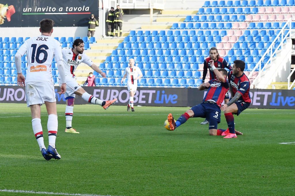 Al 23′ il Genoa passa in vantaggio con Destro all’ottavo centro stagionale: Perin rilancia lungo e Shomurodov di prima intenzione serve il compagno di reparto recuperando un disimpegno di testa impreciso di Magallan, tradito dalla traiettoria del pallone. Zajc, servito da Destro, cerca prima di servire Shomurodov, ma una deviazione restituisce il pallone a Destro che incrocia e batte Cordaz.